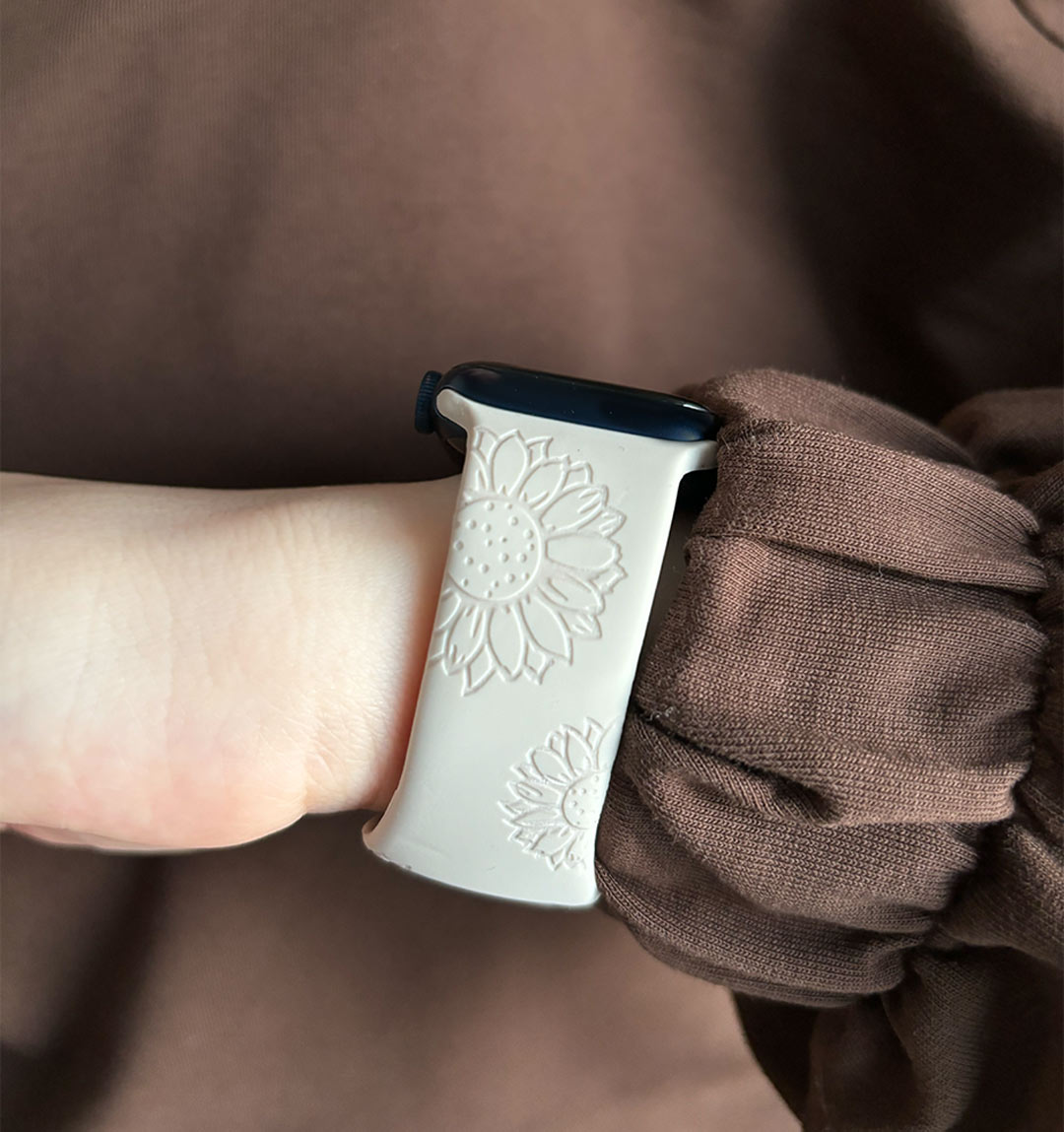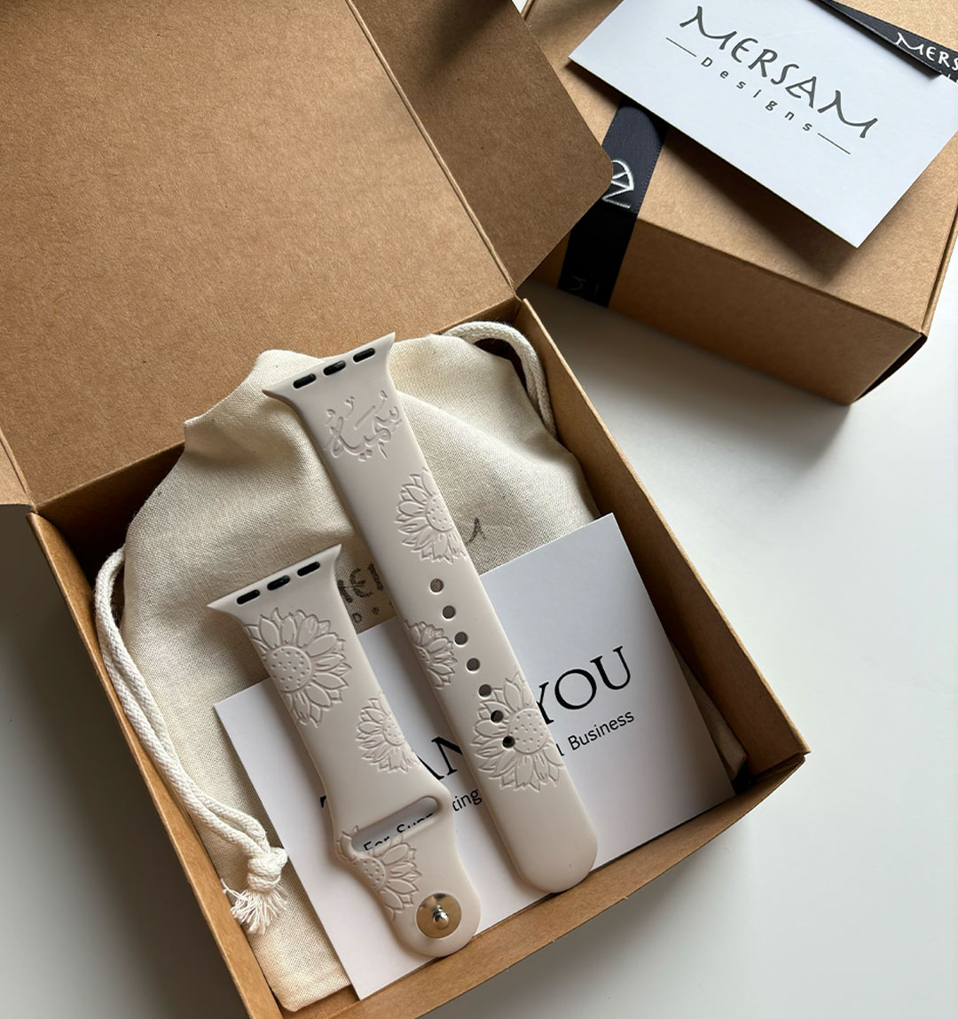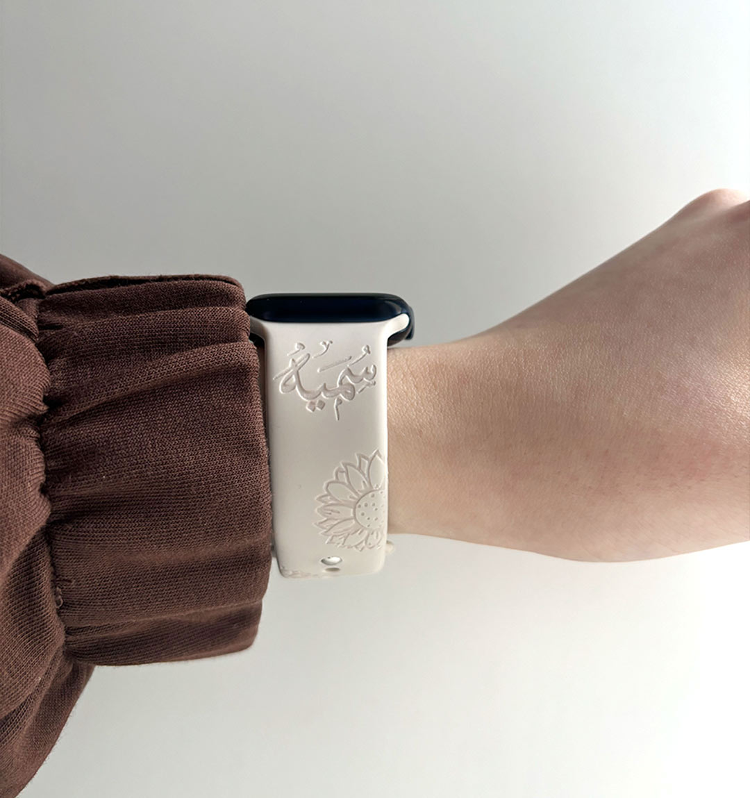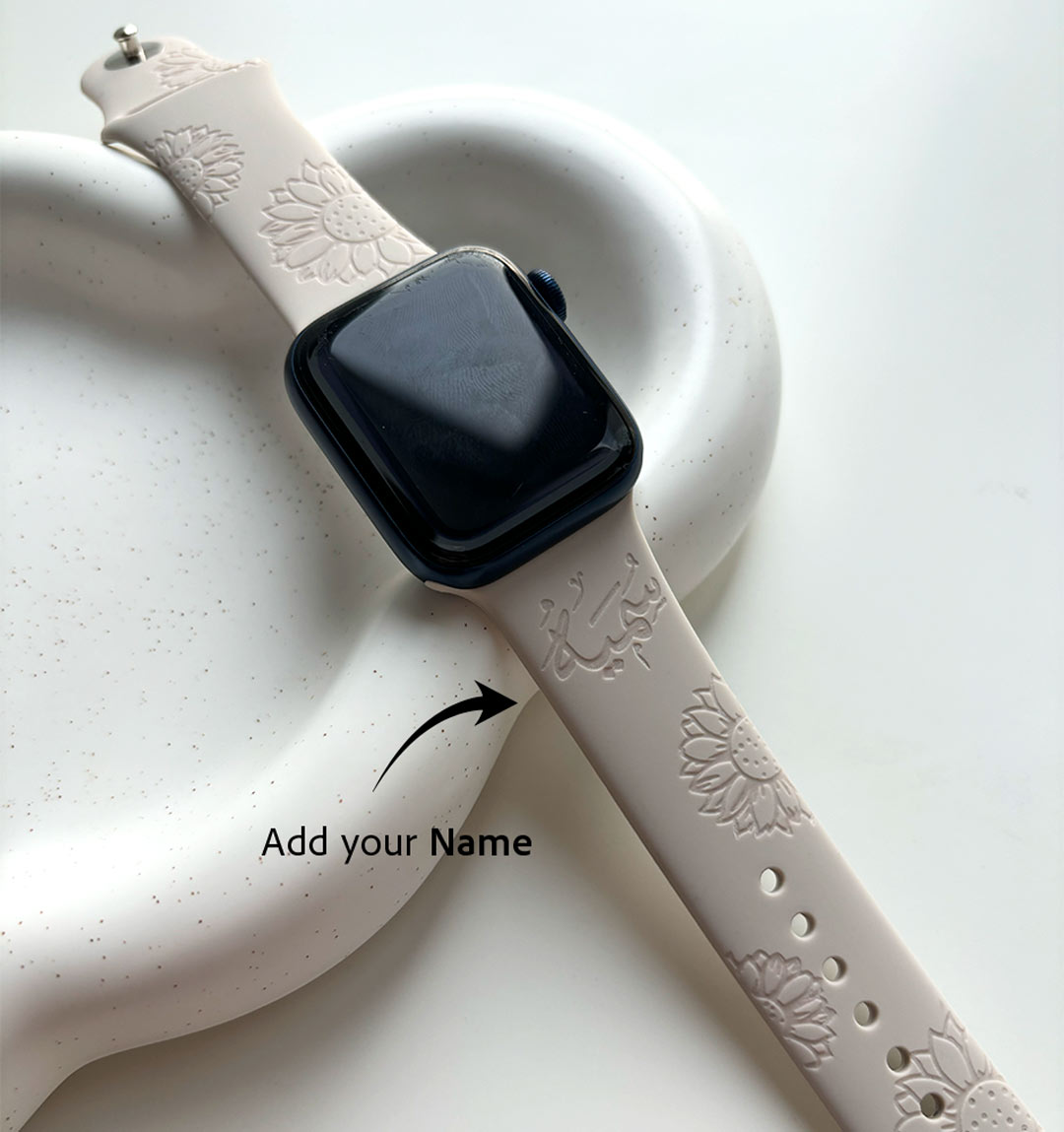This Apple Watch strap features beautifully engraved sunflower blooms alongside your personalized Arabic name. A subtle, sunny design for daily wear.