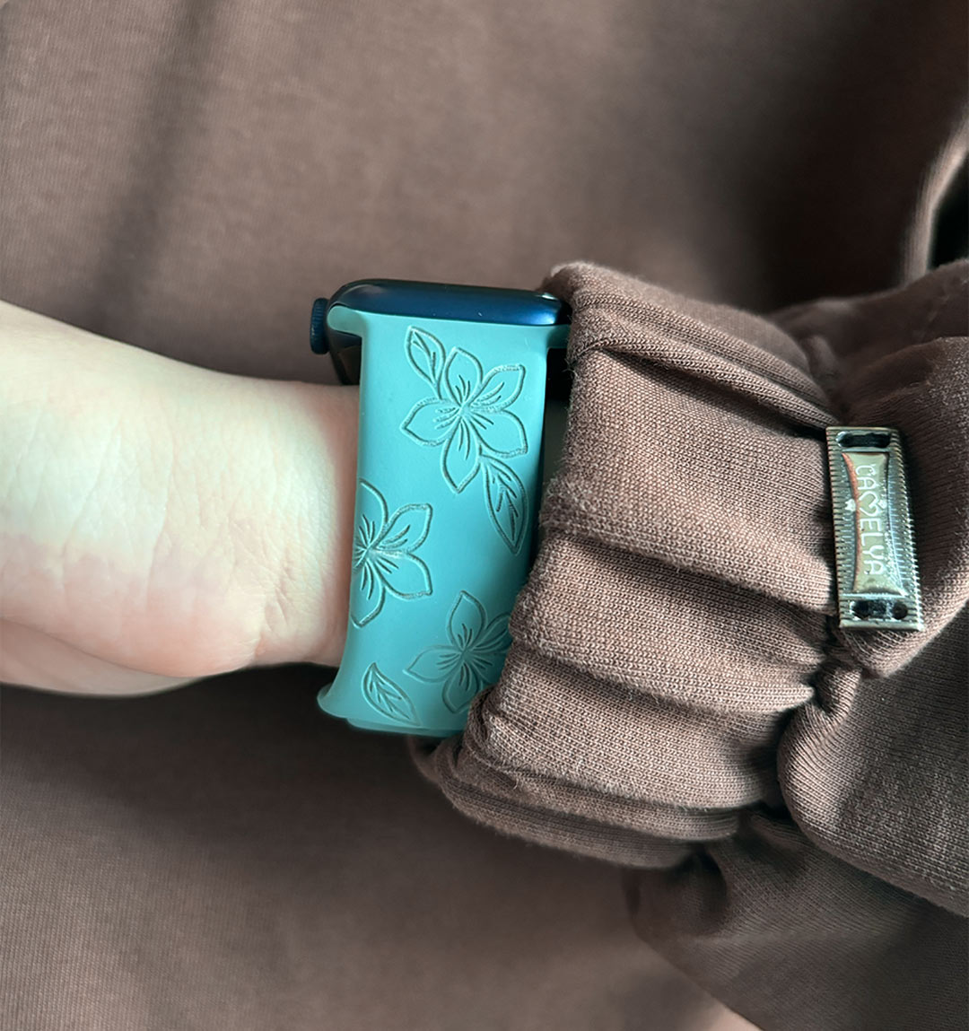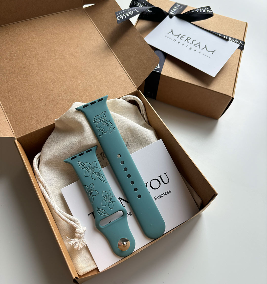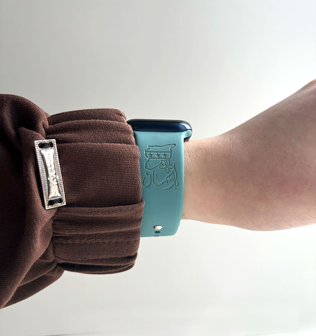 This custom Apple Watch strap blends elegance with meaning—engraved with the Syrian map, your Arabic name, and a floral pattern. It’s a subtle but bold expression of identity.